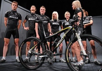 Halls-Team w roku olimpijskim nie zmienił ani składu personalnego, ani kolorów koszulek. Nadal „cukierki” pojawiać się będą na linii startu w czarnych trykotach, a rowery dostarcza firma SCOTT. To najnowszy model karbonowego sztywnego hardtaila SCALE - niezwykle lekkiego, wyposażonego w pełna grupę Shimano XTR oraz akcesoria z karbonowej serii PRO. Całość od dołu zamykają opony Geax, a od góry - kaski także sygnowane przez SCOTTa, o których sami zawodnicy mówią, że to najładniejsze ze wszystkich, które mieli dotychczas.