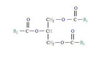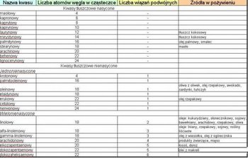Estry zbudowane z 3 cząsteczek kwasów tłuszczowych (R1, R2, R3) i jednej cząsteczki glicerolu. W przyrodzie występują głównie triacyloglicerole mieszane, zawierające różne reszty kwasów tłuszczowych w różnych położeniach. Kwasy tłuszczowe zbudowane są z węgla C, wodoru H i tlenu O. Mogą być nasycone – wszystkie atomy węgla są połączone z atomem wodoru wiązaniem pojedynczym „-” , lub nienasycone – nie wszystkie atomy węgla są połączone z atomem wodoru, co powoduje obecność wiązań podwójnych „=”. W tłuszczach spożywczych oraz lipidach ustrojowych kwasy tłuszczowe mogą występować w postaci: -nasyconej – mają wyłącznie wiązania pojedyncze, zazwyczaj o konsystencji stałej -jednonienasyconej – mają jedno podwójne wiązanie -wielonienasyconej – mają dwa i więcej wiązań podwójnych, zazwyczaj o konsystencji płynnej Nazwy poszczególnych kwasów i ich źródła występowania przedstawiono w tabeli 1.