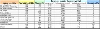 Źródła tłuszczów w żywieniu Prawie połowę spożywanego tłuszczu stanowią wyodrębnione tłuszcze jadalne, roślinne lub zwierzęce. Tłuszcze roślinne otrzymuje się z nasion lub owoców roślin oleistych, a tłuszcze zwierzęce z tkanek lub mleka zwierząt lądowych i morskich. Źródłem tłuszczu zwierzęcego, oprócz tłuszczów jadalnych (masło, smalec, słonina) są mięso i wędliny, ryby, jaja oraz produkty mleczne. W mięsie, zależnie od gatunku zwierzęcia i części tuszy, zawartość tłuszczu może się wahać od 3- 55% , podobnie w wędlinach. Ryby zawierają około 0,1-13% tłuszczu, mleko pełne 3-3,5%, sery twarogowe 1-9%, sery podpuszczkowe dojrzewające (żółte) 17-30%, sery topione 30%, a jaja około 11%. Głównym źródłem tłuszczu roślinnego w diecie przeciętnego Polaka są margaryny, stanowią one około 60% spożywanego tłuszczu roślinnego. Pozostała część pochodzi z olejów ciekłych, których niestety spożywamy zbyt mało, oraz z produktów zbożowych. Znaczących ilości NNKT dostarczają wyłącznie produkty roślinne i ryby. Dobrymi źródłami tych kwasów są oleje jadalne. Dużą zawartość tłuszczu obserwujemy w frytkach 7 – 25%, pączkach od 20%, chipsach do 40% czy w ciastach kruchych lub francuskich do 50%. Tak wysoka zawartość tłuszczu w typowych produktach żywności wygodnej powoduje, iż wielokrotnie przekraczamy zalecany przez FAO/WHO wskaźnik ilości energii pochodzącej z tłuszczów w diecie (15-30%). Spowodowane jest to obróbką technologiczną. Smażenie w tłuszczu, nawet chudych produktów powoduje przekroczenie zalecanych kalorii tłuszczowych. Producenci w celu utrwalenia produktów uwodorniają NNKT, obniżając ich poziom w produktach od 5% do całkowitej eliminacji. Tłuszcze smażalnicze są wchłaniane przez smażony produkt, przy jednoczesnym obniżeniu zawartości wody. Powoduje to szybki wzrost kaloryczności produktów. Jednak nawet niekorzystne żywieniowo frytki podane z surówką, jarzyną i filetem rybnym z grilla komponują się w pełnowartościowy posiłek. Warto pamiętać o tłuszczach idąc do McDonald’a. Przeciętny zestaw: średnie frytki (13,4g), hamburger (8,0g) lub BigMac (23,8g), sos do sałatki Winegret (20,52g) i lody z polewą czekoladową (10,4g), w zależności od naszej aktywności fizycznej i wieku, może pokryć od połowy do całości naszego dziennego zapotrzebowania na tłuszcz. Dokładne dane zawartości tłuszczu w wybranych produktach przedstawia tabela 2.
