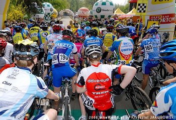 Na oznaczonej już trasie pojawiają się pierwsi zawodnicy, jest ekipa Ukrainy, pojawia się jak zwykle wzbudzający zainteresowanie Team Lotto. Wieczorem właściwie na trasie najwięcej jest młodych zawodników, ci starsi już dawno zapoznali się z terenem i teraz w rękach masażystów spokojnie spędzają czas relaksu. A przed Zamkiem praca wre jak w ulu - dziesiątki ludzi mocuje linki reklamowych balonów, wózkami i czterokołowcami rozwozi na trasę bramki i banery sponsorów. Działa juz Biuro Zawodów, w którym jak zwykle miłe Panie w pocie czoła przygotowują wszystkie te nieuniknione formalne sprawy - listy, identyfikatory, przydziały, rozdziały itp itd… Po dwunastu godzinach od pojawienia się pierwszych słupków, teren wokół Zamku zmienił się nie do poznania - powstało wielkie żółto-kolorowe „dmuchane” miasto, ale praca mimo późnej pory wciąż trwa. I tak do samego rana, kiedy jeszcze w poranno-mrocznym pokoju zdziwiony słyszę jakiś monotonny głos spikera - czyżbym zasnął przy włączonym telewizorze ? Jednak z padających słów wyławiam - „…i przypominam ze o 8.20 odbędzie się pierwsza odprawa techniczna…”
