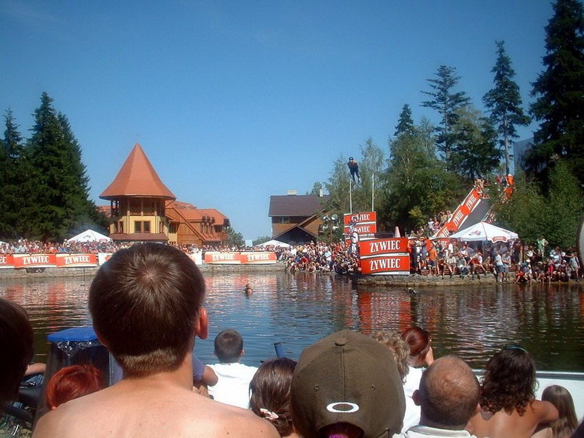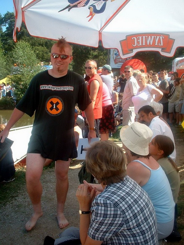 Aby zapomnieć o ogarniającej nostalgii związanej z końcem Festiwalu rokrocznie organizatorzy jako jego kulminację organizują najbardziej widowiskową konkurencję: skoki do wody. W tym roku oprócz lokalnych faworytów takich jak Nypel, Zabi czy ubiegłoroczny triumfator Szymon Kozakiewicz mogliśmy także, dzięki zaproszeniu firmy Merida Polska oglądać popisy dwóch znakomitych Austriaków: Daniela Pretninga i Ronalda Herrera, którzy prezentowali świetne BMXowe tricki. Jednak Skoki do wody to nie konkurs na dircie, dlatego też ponownie wygrał, prezentując brawurowy styl Szmon Kozakiewicz. Konkurs jak co roku brawurowo komentował Irek Bieleninik, jednak w pamięć widowni najbardziej zapadł występ Bodzia Podolska, który co prawda w locie zaprezentował się przeciętnie, jednak jego wyjście z wody zapewne śni się do dziś wielu paniom, zwłaszcza tym oglądającym konkurs od strony rozbiegu na skocznię :)Na koniec, po krótkim „spiczu” kończącym całą imprezę w wodzie wylądował szef całego przedsięwzięcia: Paweł Kibiń.
