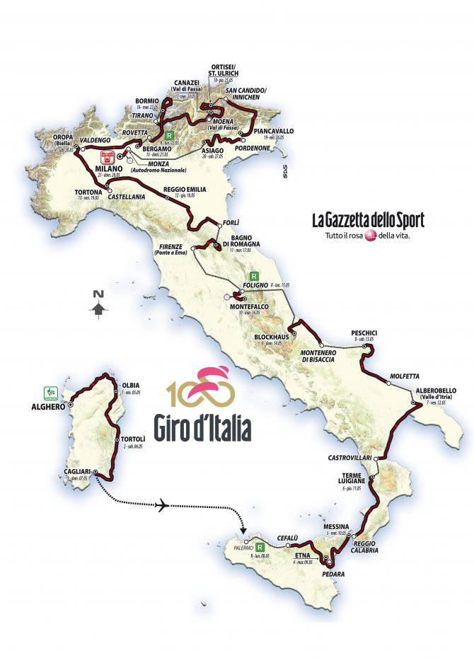 Wyścig rozpocznie się na Sardynii, gdzie przez trzy dni sprinterzy będą mieli okazję by walczyć i wymieniać się maglia rosa. Po dniu transferu na Sycylię, peleton wspinać się będzie na Etnę i już tam po raz pierwszy górale wkroczą do akcji. Stamtąd kierować będą się na północ, a etapy do Messyny, Terme Luigiane, Alberobello i Peschici będą dogodną okazją dla sprinterów i harcowników. Faworyci pierwszy tydzień wyścigu zamkną krótkim, ale intensywnym etapem z metą na Blockhaus, po prawie 30 kilometrach wspinaczki. Po dniu przerwy, przeznaczonym na transfer w głąb kraju, rozgrywana będzie czasówka w Umbrii – równie ważna, co górskie etapy. Aż 39 kilometrów w pofałdowanym terenie może być bardzo ciężkie dla typowych górali, z kolei czasowcom ułatwi zadanie walki o klasyfikację generalną. Od tego momentu już prawie każdy etap będzie bardzo ciężki, ważny i niemalże kluczowy, bo wyścig przekroczy półmetek. Następnego dnia, gdy kolarze kręcić się będą po Toskanii, czeka na nich górski etap, choć jeszcze nie w wysokich górach. Górale chwilę wytchnienia będą mieli następnego dnia, na najdłuższym etapie do Reggio Emilia, którego ostatnich 100 kilometrów jest całkowicie płaskie. Płaski jak stół będzie także 13. etap, z metą w Tortonie, ale już kolejny to wspinaczka na legendarną Oropę, gdzie w 1999 roku Marco Pantani we wspaniałym stylu wrócił na szczyt, tylko po to, by dzień później zostać zdyskwalifikowanym za zbyt wysoki poziom hematokrytu we krwi.