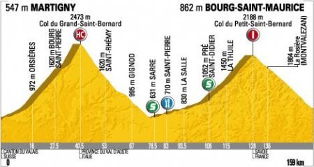 Na czele jechało więc 20 kolarzy, którzy po przejechaniu 5 km mieli 30 sekund przewagi nad peletonem. Podjazd pod Col du Grand-Saint-Bernard (HC, dł. 24,4km, śr nachylenie 6,2%, na 40,5km) rozpoczynali 2 minuty przed grupą zasadniczą, prowadzoną przez Astanę. Na 2km podjazdu zaatakował Pellizotti, zabierając ze sobą Karpetsa. Jego najgroźniejszy rywal w klasyfikacji górskiej, Martinez, był jednak czujny i chwilę potem dołączył do prowadzącej dwójki. Mieli wtedy około 10 sekund przewagi nad ucieczką.