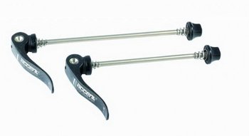 również należą do tzw. wagi ultralekkiej. Niską masę uzyskano dzięki dźwigniom wykonanym z włókna węglowego i drążonym osiom ze stali Cr-Mo. Zacisk piasty tylnej (M5x145) waży 38 gramów i przeznaczony jest do piast o szerokości 135 mm. Zacisk piasty przedniej (M5x110) waży 32 gramy i przeznaczony jest do piast o szerokości 100 mm. Zacisk tylny: 89,90. Zacisk przedni: 79,90. Cena: 169 zł.