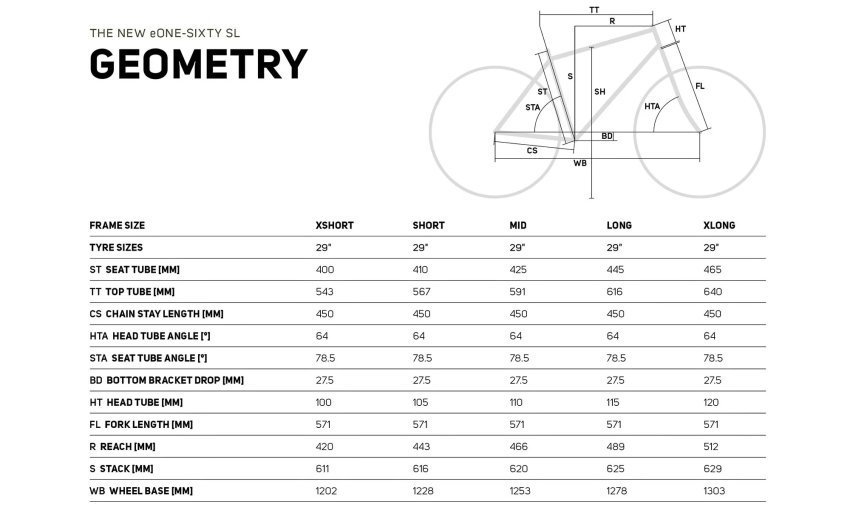 Nowoczesna, progresywna geometria odzwierciedla agresywne zastosowanie roweru. Płaski kąt główki ramy (64º) w parze z ultra-stromą podsiodłówką (78.5º) i długi reach, wynoszący 489mm w rozmiarze L oraz widełki łańcuchowe o długości 450mm mają zapewniać stabilne prowadzanie i jednocześnie dużo miejsca na manewrowanie rowerem.