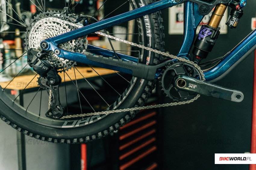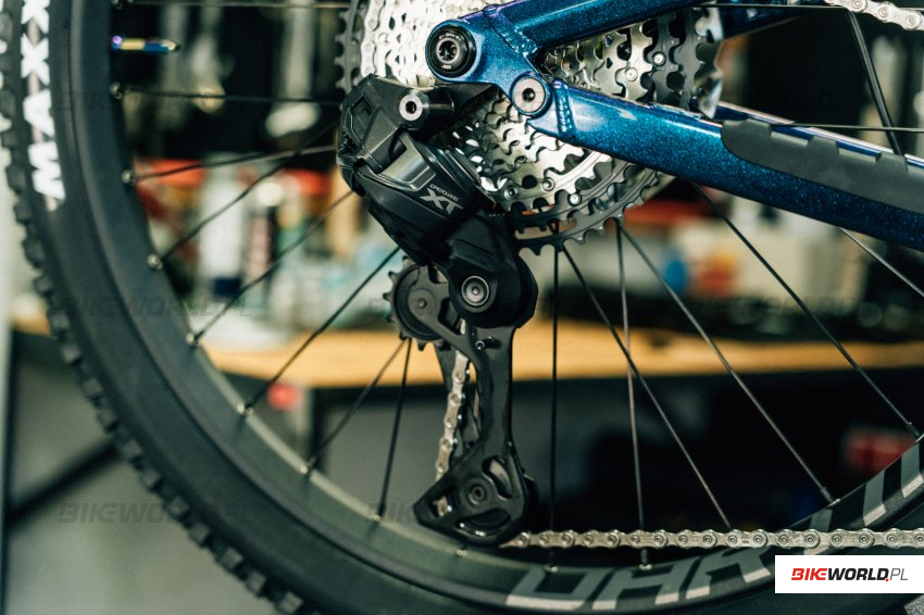 Filarem nowej grupy Deore XT jest przerzutka tylna M8250, która została wykonana zgodnie ze wszelkimi najnowszymi technologiami Shimano. Przerzutka mocowana jest tradycyjnie do haka, a jej kształt został opracowany zgodnie z technologią Low Profile Design.Taka niskoprofilowa konstrukcja sprawia, że przerzutka nie odstaje mocno od ramy i nie jest wyeksponowana na uderzenia o kamienie. Dodatkowo jej kształt jest mocno zaokrąglony, aby – gdy dojdzie już do kontaktu – ocierać się o przeszkody, a nie zahaczać o nie. Kolejny ważny aspekt to technologia Shadow ES, czyli nowe rozwiązanie Japończyków, w którym przerzutka nie ma już sprzęgła, a w zamian są dwie sprężyny, które mają zapewnić pełną stabilizację łańcucha i dobrą jakość przerzucania biegów. Shimano podkreśla też, że mocno poprawiona jest wytrzymałość komponentów, powiększone są zawiasy, na których pracuje oraz wzmocnione są newralgiczne punkty. Widać to choćby po wózku, który jest grubszy, niż M8100, ma więcej materiału i mocno chroni też dolne kółko przerzutki. Wózek w całości wykonany został z aluminium, natomiast kółka są pełne, aby nie zbierać do siebie traw i gałązek. Gdy przyjdzie nam pechowo trafić w skałę, przerzutka ma też przydatną funkcję Automatic Impact Recovery, czyli najpierw poddaje się i chowa pod wpływem uderzenia, a następnie wraca do pierwotnej pozycji i pozwala kontynuować jazdę. Wzorem grupy XTR, Deore XT również ma dwie opcje – SGS, czyli dłuższy wózek do kaset 10-51 oraz GS, wózek krótszy do kaset 9-45. Ten pierwszy wariant z uwagi na lepszą wydajność napędu dedykowany jest do XC, natomiast drugi zwiększa ilość miejsca między zębatką przednią i wózkiem, a podłożem i dlatego – mimo, że jest lżejszy – przeznaczony został do enduro. Warto bowiem dodać, że XT do linia osprzętu o bardzo szerokim zastosowaniu – od XC, przez Down-Country, Trail, aż po Enduro. Do tego dochodzi jeszcze e-MTB, ale tutaj mamy już osobą przerzutkę M8260, która jest zasilana z baterii e-bike’a oraz – jeśli mamy silnik Shimano – może korzystać z ciekawych funkcji FREESHIFT i AUTOSHIFT.