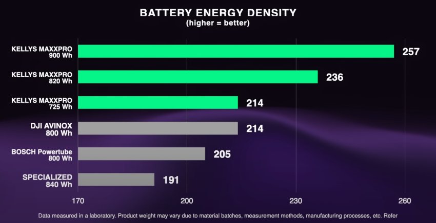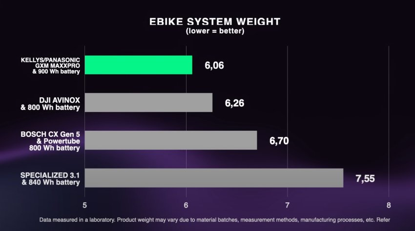 Cały system składa się z autorskich baterii Kellys’a oraz silników Panasonic GXM Maxxpro, czyli specjalnie przygotowanej jednostki, która dla Słowaków ma dedykowane oprogramowanie i większą moc, niż standardowe modele GXM, jakie spotkacie w innych rowerach na rynku. Zacznijmy od nowych baterii, które nazywają się dokładnie Kellys K2 Maxxpro Carbon i dostępne są w trzech pojemnościach – 900 Wh, 820 Wh i 725 Wh. Korzystają z ogniw o wysokiej gęstości, a do tego mają karbonowe obudowy, co przekłada się na rekordowo niską masę – 900 Wh waży 3,5 kg! Dla przykładu 840 Wh Specialized’a to 4,4 kg, a Bosch czy DJI 800 Wh również są cięższe.