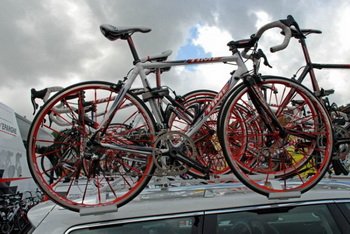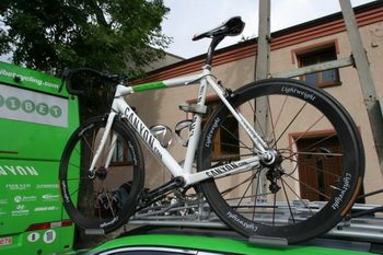 Zanim zajmę się poszczególnymi modelami kilka uwag ogólnych. Sprzęt jest drogi i zazwyczaj są to najwyższe modele w kolekcji danego producenta, ale nie oznacza to, że są to wyłącznie najlepsze rzeczy dostępne na rynku. Zazwyczaj za to te, które mają się sprzedawać. W dodatku zawodnicy mają swoje fobie i przyzwyczajenia (pedały i siodła), powstaje więc swoiste połączenia produktów promowanych i ulubionych. Jeśli dołączymy do tego jeszcze zabiegi zakulisowe, blokujące np. użycie kół Mavica z napędem Shimano - bo Shimano produkuje własne koła - wychodzą właśnie takie rowery jak widzimy. Najważniejszy chyba trend to karbonowe obręcze, oczywiście jak zwykle z szytkami. Ich użycie pozwala swobodnie, szczególnie w zestawieniu z karbonowymi ramami, złożyć rower ważący poniżej 6 kg. I gdyby nie przepisy UCI, które nie dopuszczają do startów sprzętu lżejszego niż 6,8 kg, zapewne większość rowerów byłaby lżejsza. Ten przepis również powstrzymuje stosowanie nieseryjnych, lekkich rozwiązań. Szkoda.