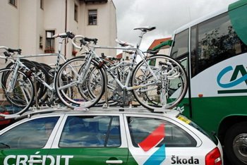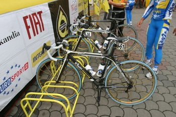 multimonolitycznej. Poszczególne większe fragmenty ramy połączone są ze sobą klejem, miejsca połączenia wzmocniono dodatkową warstwą włókien. Widelec to nie jest własna konstrukcja firmy, pochodzi od Mizuno i jest w całości karbonowy. Rower wyposażony jest w komplet Campagnolo Recorda, koła Fulcruma (karbonowe lub aluminiowe), sztycę Ritcheya, mostek i kierownicę ITMa. To kolejna grupa która używa siodełek Fizika i opon Vittorii. Swoją drogą na niektóre wysokie stożki Fulcruma aż żal było patrzeć, widać było, że źle znoszą kraksy. Zawodnicy jednak się nie patyczkują i dopóki sprzęt jeździ nikt się nie przejmuje szczegółami.