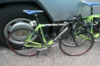 suportu, gdzie kryje się środek BB30 z wielkimi łożyskami (ma to być nowy standard), na osi zaś osadzono superlekką korbę Hollowgram Si. Ta korba waży tylko 580 gramów! Tylne widełki w zestawieniu z głównymi rurami są wybitnie szczupłe, ale za to podobno tłumią drgania. Drugi z używanych przez zawodników modeli to System Six - z karbonowym przodem, ale aluminiowym tyłem. Ten tył to konstrukcja z aluminium lotniczego o oznaczeniu CAAD9. Zawodnicy teamu używali Campagnolo Recorda, ale w trakcie TdP różnych kół. Obok różnych modeli Fulcrumów były to też Lightweighty. I znów można było dostrzec, że zawodnicy jeżdżą na standardowych, seryjnych ramach, by osiągnąć pożądaną pozycję kombinują z długimi mostkami i przesuwaniem siodeł ku tyłowi. Ciekawoska to fakt, że stosowali przy tym rzadko spotykane sztyce karbonowe Recorda, ale mostki FSA. Pedały to Looki Keo w specjalnej wersji teamowej z logiem Liquigas.