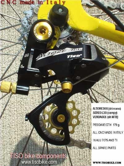 Niezależny włoski producent komponentów rowerowych, TISO Bike Components w lutym br. zapowiadał wprowadzenie do sprzedaży własnej tylnej przerzutki, która miała ważyć 183g, być wykonana z aluminium i tytanu i zapewniać kompatybilność z manetkami Shimano i Campagnolo. Teraz zaprezentowano aż trzy przerzutki: SEREO, ALTORE i VENDA.Wszystkie wykonano metodą CNC z aluminium 7075t6, piwoty są z tytanu 6al4v, mają łożyska ślizgowe, regulację naciągu linki przy przerzutce i kółka napinacza z dużymi otworami ulżeniowymi. Możliwe jest samodzielne serwisowanie przerzutki dzięki zapewnieniu przez producenta dostępu do wszystkich ponad 50-ciu w pełni wymiennych części składowych. Geometria i kinematyka pantografu zostały tak dobrane, aby przerzutki mogły współpracować także z kasetami do rowerów górskich o dużej rozpiętości przełożeń. Przerzutki są dostępne, (a raczej będą pod koniec tego roku), w dwóch wariantach kolorystycznych: czarno – srebrnym lub czarno – złotym.