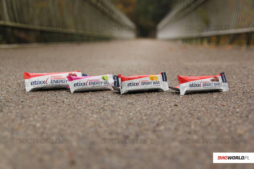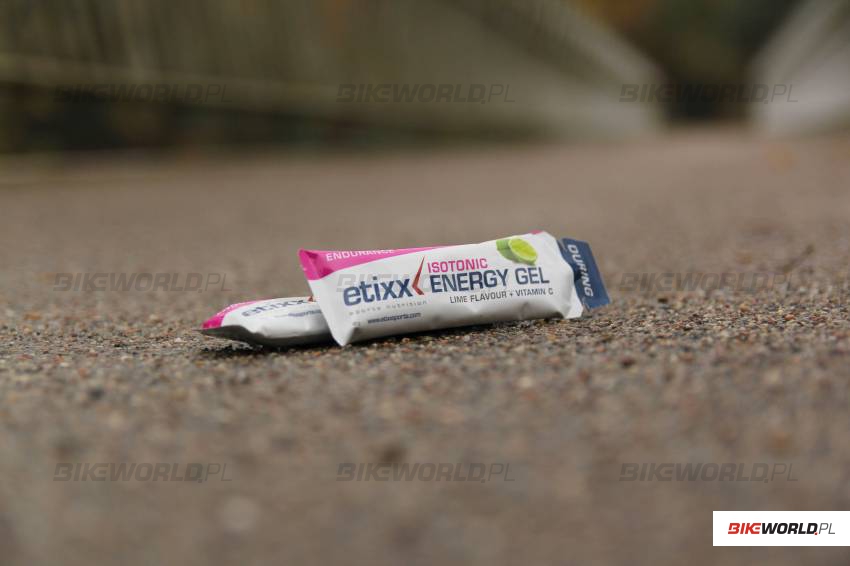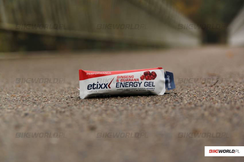 Z powyższego powodu jednym z ulubionych źródeł energii podczas intensywnego wysiłku są żele energetyczne - są małe i treściwe energetycznie. Mieliśmy okazję spróbować dwóch rodzajów żeli Etixx - izotonicznego o smaku limonki oraz wiśniowo-porzeczkowego z dodatkiem ginsengu i guarany (czyt. pobudzającego żelu z kofeiną).