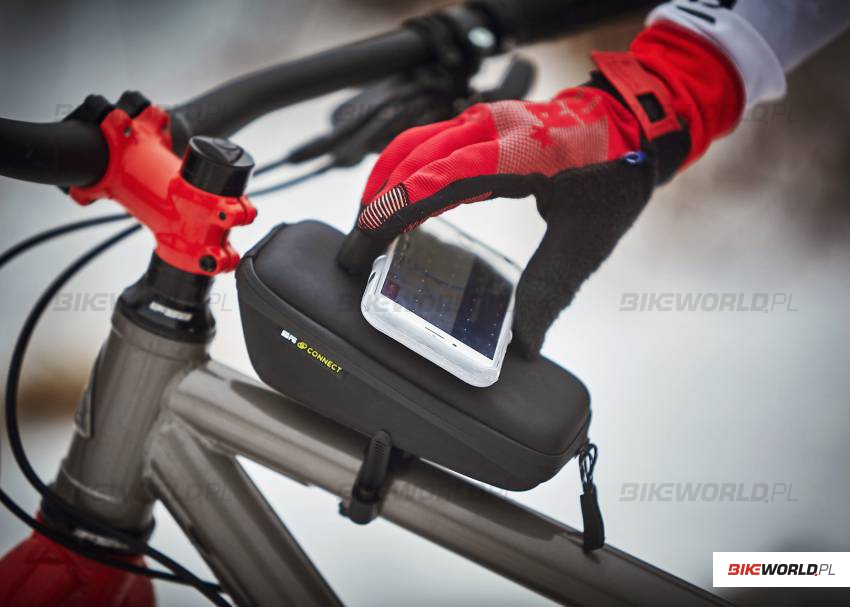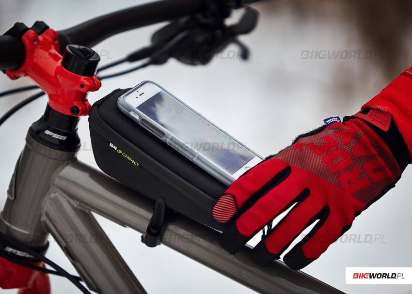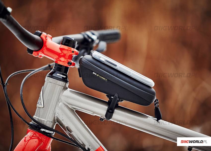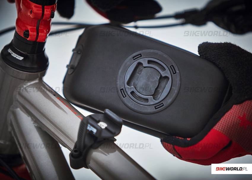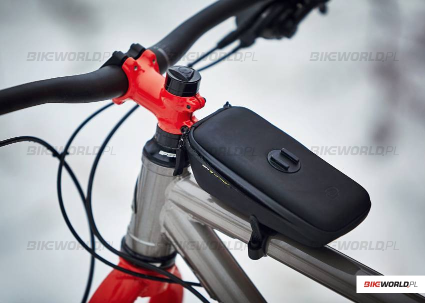 Wedge Case to nic innego jak sztywny, niewielki case do przewozu drobiazgów. Zgodnie z filozofią Connect na jego górnej części znajdziemy miejsce do zamontowania naszego smartfona, a części przedniej jeszcze jedno gniazdo - to dedykowane jest dla specjalnej lampki. Torbę do roweru przytwierdzamy za pośrednictwem wspomnianego wcześniej uchwytu (widoczny na poniższym zdjęciu) - jest on uniwersalny i możemy przymocować go praktycznie wszędzie: na kierownicę, sztycę czy rurę ramy. Do przytwierdzenia mocowania potrzebujemy imbusa, którym dokręcamy plastikową śrubę blokującą w odpowiednim miejscu pasek zębaty.