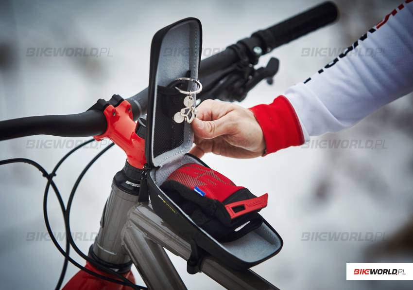 Wedge Case podobnie jak etui na telefon otrzymał matowe wykończenie i pochwalić może się bardzo dobrą estetyką. Pojemnik wyposażono w uszczelniane zamki, a w środku materiałowe wykończenie - tak, aby przewożone drobiazgi były bezpieczne. W pojemniku bez problemu zmieścimy najważniejsze rowerowe akcesoria pierwszej potrzeby lub prywatne drobiazgi - znalazło się tam też miejsce na przegródkę np. dla dokumentów czy karty płatniczej.