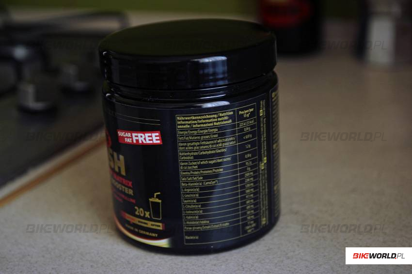- Składniki: chlorowodorek L-argininy, substancja zakwaszająca (kwas cytrynowy), beta-alanina, mieszanka BCAA (L-leucyna, L-izoleucyna, L-walina), jabłczan L-cytruliny, tauryna, aromat, dekstroza, barwnik (beta karoten), chlorowodorek L-histydyny, ekstrakt z korzenia żeń-szenia, substancje słodzące (sukraloza, acesulfam-K), nikotynamid, barwnik (błękit patentowy V). Zawiera cukier i substancje słodzące. Może zawierać gluten, jaja, soję, mleko.