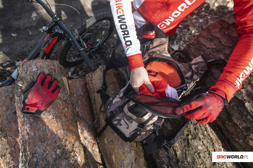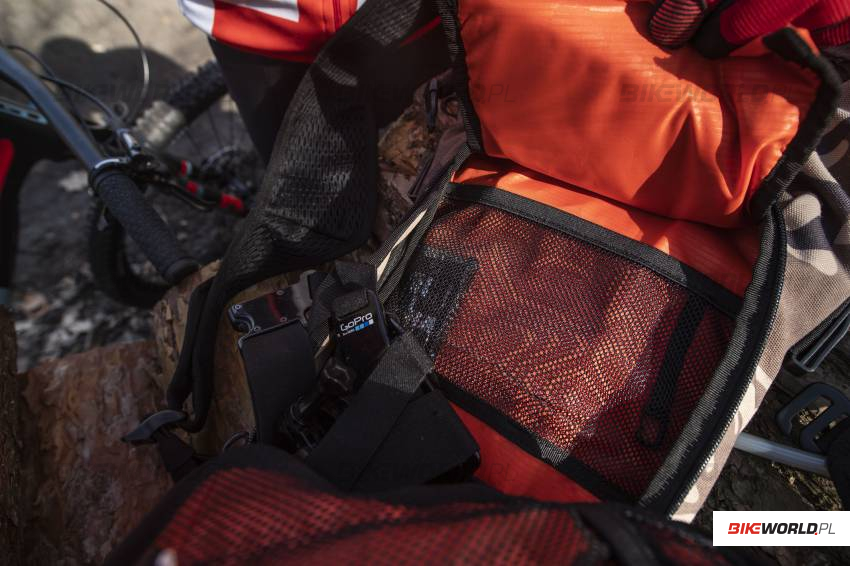 Unzen 4 Enduro dzieli się przede wszystkim na dwie części - na zewnątrz mamy dużą kieszeń główną, do której zmieścimy naszym zdaniem wszystkie podstawowe akcesoria wymienione powyżej. Przestrzeń w tej kieszeni jest bardzo dobrze zorganizowana - mamy sporo mniejszych kieszonek z siatki, więc wszystko możemy ułożyć sobie w pedantycznym wręcz porządku. Co jest niepozorne, ale pomocne, to jaskrawopomarańczowe wykończenie wnętrza plecaka - za sprawą swojej jasności ułatwia odnalezienie potrzebnych nam akcesoriów. Na górze plecaka mamy do dyspozycji małą kieszonkę na suwak (uszczelniany) - kieszonka jest bardziej miękka, a jej wnętrze to dellikatny, miły w dotyku filc - jest zatem idealna na przechowywanie np. smartfona, bo mamy do niego łatwy dostęp, jest dobrze chroniony i nie ma ryzyka jego porysowania. Na wierzchu plecaka znajdziemy jeszcze osobną kieszonkę, np. na butelkę z napojem. Z drobnych, ale ważnych elementów - na boku plecaka znajdziemy klips, do którego możemy przymocować kask (np. przemierzając odcinek dojazdowy podczas zawodów enduro), producent przewidział też dedykowane miejsce na lampkę.