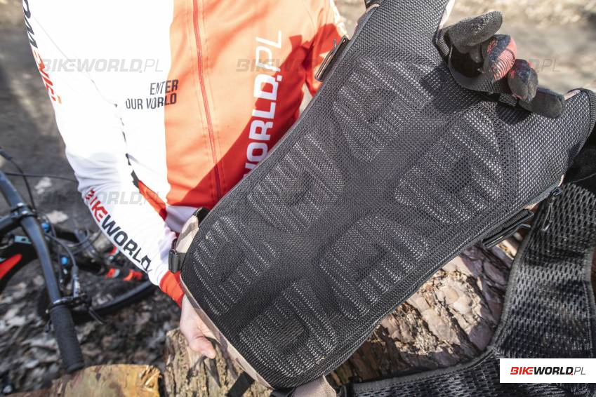 Tym co Shimano zdecydowanie poprawiło w Unzen 4 Enduro, jest panel, który styka się bezpośrednio z plecami - zasadniczo ma on dwie funkcje: ma chronić plecy przed skutkami ewentualnego upadku i zapewniać dobrą wentylację pleców. Z obu tych zadań Shimano wychodzi naszym zdaniem obronną ręką. Otóż po pierwsze - z tyłu zastosowano 6 paneli z czegoś w rodzaju gąbki (ale takiej twardszej), która ma pofalowaną strukturę. Tył plecaka jest też trochę utwardzony sam w sobie. W przypadku upadku na plecy te elementy na pewno mocno zamortyzują uderzenie. Po drugie - z racji na zastosowanie paneli oraz ich struktury, a także przykrycia całości siateczką, plecak na stosunkowo niedużej przestrzeni styka się z plecami a także umożliwia w miarę swobodny przepływ powietrza. To wszystko pozwala określić Unzena naprawdę komfortowym plecakiem.