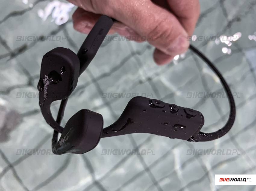 Aftershokzy przylegają do uszu w charakterystyczny sposób dla produktów tej marki. Są pewnie i komfortowo dociśnięte do kości czaszki, jednak na tyle lekko, by nie powodować dyskomfortu. Przetworniki połączono za pomocą charakterystycznego pałąka, który biegnie z tyłu głowy i łączy obie ,,słuchawki”. Wygodnie pływa się w nich z okularami pływackimi, ale bez czepka. Jeśli zdecydujemy się, bądź jesteśmy zmuszeni, używać nakrycia głowy to trzeba się odpowiednio napracować, by założyć to wszystko w niekolidujący sposób. Na drodze naszych prób wiemy, że będzie trzeba zsunąć czepek z uszu, tak będzie najprościej. Podobnie z jazdą na rowerze - wszystko jest doskonale dopóki nie używamy zimowej czapki nausznej. Jazda z nią - podobnie jak pływanie z czepkiem - jest możliwa, ale obniża komfort użytkowania. Jeśli jednak korzystamy z nich w idealnym scenariuszu, czyli tylko kask i okulary na rowerze lub gogle pływackie na basenie, wówczas możemy spodziewać się wyśmienitego komfortu noszenia.