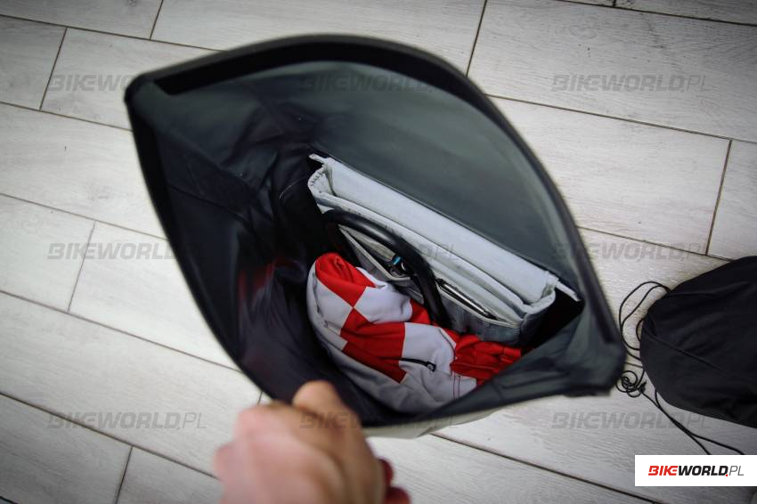 W tym temacie oczywiście kluczem jest to, jaki wariant sakwy wybierzemy, natomiast warto zacząć od pojedynczej sakwy 17-litrowej. Powyższa posiada wewnątrz dedykowaną kieszeń na laptopa, która jest zabezpieczona dookoła miękką gąbką, a dodatkowo posiada na zewnętrznej stronie siateczkowe kieszenie - dla lepszej organizacji przewożonych drobiazgów. Wyściełana kieszeń pomieści 15-calowego MacBooka lub 14-calowego PC-ta, a do tego mamy jeszcze osobną kieszeń na tablet. Każda z testowanych sakw ma w zestawie pasek na ramię - także nic nie stoi na przeszkodzie, żeby sakwę szybko zdemontować i zabrać ze sobą do biura. Warto jednak doprecyzować, że sakwa 17-litrowa posiada jedną, dodatkową kieszonkę zewnętrzną - ta tez może się przydać na drobiazgi, np. klucze.