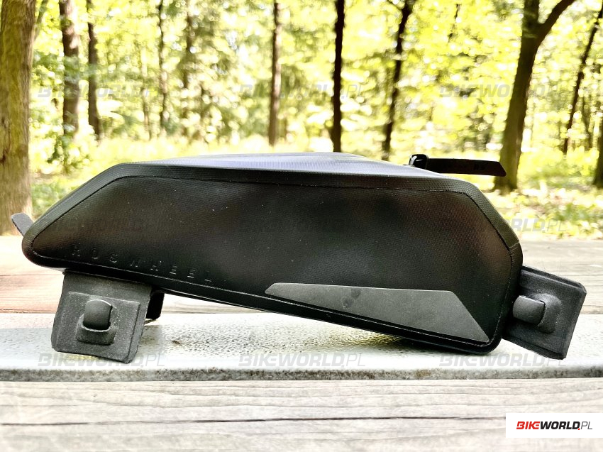 Torba pod ramę Road to kolejne popularne akcesorium rowerowe marki Roswheel. Również w rozmiarze S (do wyboru jest także rozmiar XS, medium i large). Mocowana jest na głównej górnej rurze naszego roweru paskami „Fast -Fix”, które utrzymują ją stabilnie, jednocześnie chroniąc ramę przed uszkodzeniami, dzięki specjalnej wstawce na górnej części torby. Sakwa zbudowana została z lekkiego wodoodpornego nylonu. Posiada specjalny zawór usuwania powietrza i wygodnie położoną łatwo odpinaną klamrę po prawej stronie (leworęcznym podróżnikom nie spodoba się takie rozwiązanie), co ułatwia sięganie po niezbędne nam przedmioty podczas jazdy. Bardzo dobrze rozkłada ciężar bagażu wzdłuż ramy, ma wyprofilowany kształt, który doskonale pasuje do ramy roweru, minimalizując wpływ na aerodynamikę. Zapewnia wygodne miejsce do przechowywania narzędzi, dętek, jedzenia czy innych niezbędnych akcesoriów. Pojemność w rozmiarze S to 2 L, wymiary - 5 x 11 x 40 cm i waga 120 gramów. Koszt wynosi 286 zł.