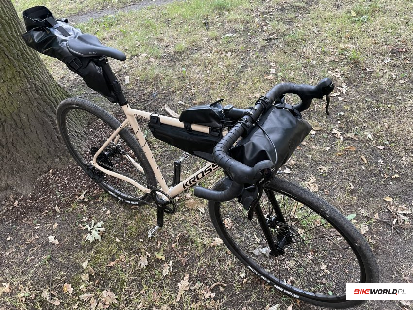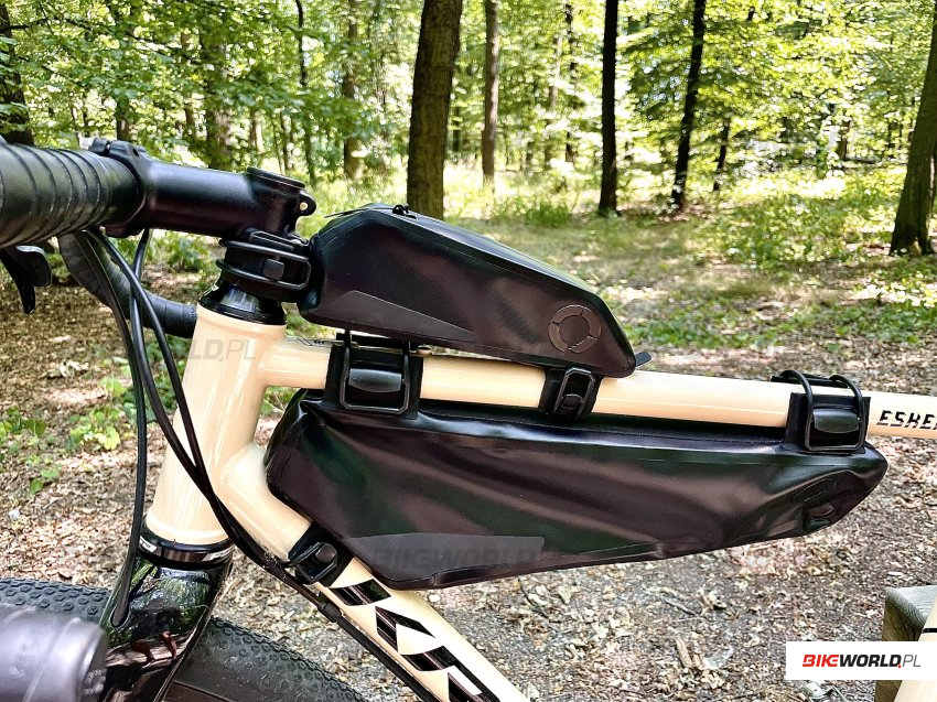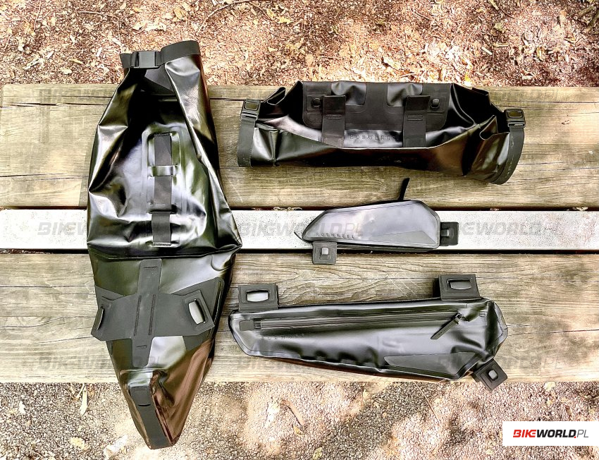 Prawie 20 litrów - tyle pomieszczą wszystkie torby. Jest to wystarczająco dużo dla jednodniowych, a może i dwudniowych wypraw. Większe rzeczy - na przykład bardziej gabarytowe narzędzia, jedzenie, czy ciuszki, można popakować do torby podsiodłowej i tej na kierownicy. Do tych toreb warto zapakować rzeczy większe objętościowo, ale stosunkowo lekkie. Do mniejszych toreb przy ramie zmieści się spory zapas jedzenia, który w łatwy sposób wyciągniemy podczas jazdy. Bardzo dobrze zaprojektowany wygodny system zapięć ułatwi korzystanie. Jedynym co byśmy dodali to dodatkowy zamek po jednej stronie z sakw - dla leworęcznych.