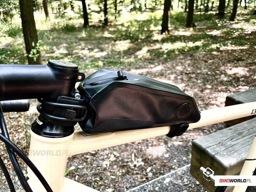 Najmniejsza torebka Road w rozmiarze S (jest jeszcze opcja powiększona, w której dodatkowo znajdziemy port na kabel), montowana jest na poziomej głównej rurze przy sterach, ma wymiary 5x7x20 cm i cechuje się pojemnością 0,5 L przy wadze zaledwie 50 gramów. Jest zbudowana z lekkiego nylonu, wodoodporna, z wygodnym zamkiem na całej długości i dużym obszarem odblaskowym. Mocowana do roweru jest paskami „Fast-Fix”, które umożliwiają szybkie i bezpieczne mocowanie w ramie roweru i zmniejszają uszkodzenia lakieru. Z racji wygodnego umiejscowienia przeznaczylibyśmy ją do niezbędnych podczas jazdy przekąsek, gdyż łatwy dostęp umożliwia szybkie wyciągnięcie z niej żelu czy batonika. Nada się również do przechowania kluczy lub drobnych narzędzi. Na styku z ramą ma specjalną pogrubioną miękką podkładkę, aby ramy nie została porysowana. Jest praktycznym wyborem, pozwalającym mieć niezbędne przedmioty w zasięgu ręki, co podczas jazdy jest dużym plusem. Koszt takiej torebki to 150 zł.