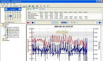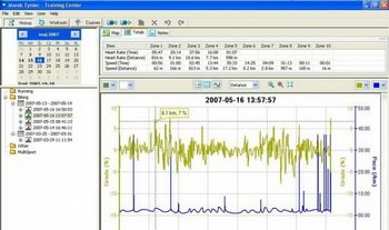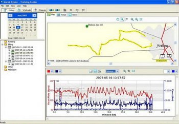Było bardzo entuzjastycznie, teraz będzie nieco mniej. Na papierze Edge 305 prezentuje się jako równorzędny konkurent dla Polarów serii S. Mnogość funkcji faktycznie to sugeruje. Możliwości ustawienia treningu interwałowego są nawet większe niż w Polarze, również ergonomia obsługi w czasie dużego wysiłku jest wyższa niż w fińskich zegarkach i licznikach. Świetną sprawą jest odliczanie do końca zaplanowanego okrążenia oraz donośny sygnał dźwiękowy. Dla tych, którzy lubią często sprawdzać swoje możliwości ciekawą opcją jest możliwość wyścigu z… samym sobą a raczej z własnym rezultatem uzyskanym wcześniej na danej trasie. Wszystko wygląda świetnie do momentu zgrania danych na komputer. Garmin współpracuje z oprogramowaniem Training Centem, które jest, delikatnie rzecz ujmując, ubogie w możliwości. Fakt, że z Edge trenują m.in. Oscar Pereiro i Julien Absalon w żaden sposób nie przekonuje. Sama możliwość oglądnięcia wykresu (dodatkowo niezbyt dokładnego) i odczytu danych tylko z wybranych punktów to zdecydowanie za mało jak na profesjonalny monitor treningu. Dodatkowo boli niemożność edycji okrążeń i zaznaczania fragmentów treningu do analizy. Niestety w tej kwestii Garmin przegrywa i to znacząco, choć z drugiej strony nie wszyscy potrzebują tak głębokiego wnikania we własną fizjologię. Jeśli w czasie jazdy naciskaliśmy „Lap”, Training Center pokaże dokładne dane dotyczące prędkości, tętna i kadencji z każdego z okrążeń. Na plus należy natomiast zapisać minimalistyczną, prostą i bardzo skuteczną podstawkę. Dwa zipy, kawałek gumy i plastikowy zatrzask trzymają pewnie Garmina na każdej kierownicy lub mostku. Wbudowany akumulator i ładowarka to rozwiązanie bardzo wygodne, umożliwiające ograniczyć wagę. W pełni naładowany Edge 305 działa ok. 12h