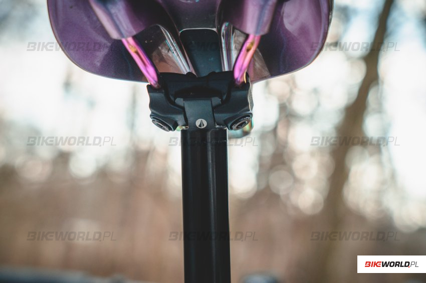 Równie dobre wrażenia pozostały nam w pamięci z montażu siodła. Jarzemko jest tu uniwersalne i pasuje do okrągłych, a także owalnych prętów. Do tego bardzo wygodny jest system dokręcania siodła. Spotkamy tu rzadki patent, gdzie śruby zlokalizowane są boku, mniej więcej pod kątem 45 stopni do sztycy. Dzięki temu mamy banalny dostęp klucza do gniazd, a do tego mamy niemal gwarancję, że nie porysujemy sztycy podczas odkręcania lub dokręcania śrub. Każdy, kto robił korektę siodełka w trasie za pomocą mini multitoola przy dropperach, gdzie śruby są w tradycyjnie w osi z ze sztycą na pewno wie, o czym piszemy… Zawsze trzeba bardzo uważać, aby gdzieś nie zarysować sztycy. Układ śrub w jarzmie, jakie zastosowano w SDG jest naprawdę dobrym i przemyślanym rozwiązaniem, choć nieco utrudnia mikro korekty pochylenia nosa siodła, bo zawsze do tego procederu trzeba rozkręcić całe jarzmo. Coś za coś… to co zrobiono w Tellis’ie V2 na pewno jest trudniejsze do uszkodzenia, szczególnie dla laika i osób bez dostępu do dobrej klasy narzędzi. Będąc przy jarzmie musimy wspomnieć o jeszcze jednej nowości względem V1, a mianowicie fakcie, że V2 ma wyraźnie niższy stack. Około 1 cm zaoszczędzono na odcinku między końcem skoku, a prętami siodła, co ponownie będzie istotnym aspektem dla użytkowników małych ram.