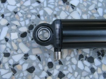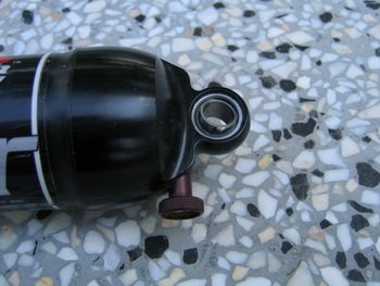 Wypada też wspomnieć o sposobie połączenia dampera z ramą. Otóż w damperze tym zastosowano połączenie kulowe (fotka obok), które w razie małej sztywności ramy zabezpiecza damper przed uszkodzeniem tłumiąc naprężenia powstałe w wyniku gięcia się ramy. Jest to bardzo potrzebne zabezpieczenie, ponieważ damper zbudowany z aluminium 7005 jest tak bardzo wycieniowany, że sztywne połączenie mogłoby być dla niego zabójcze. W testowej ramie Santa Cruz Blur nie ma raczej takiego zagrożenia, ponieważ rama ta ma jeden z najwyższych na świecie współczynników sztywności do wagi wśród ram XC.