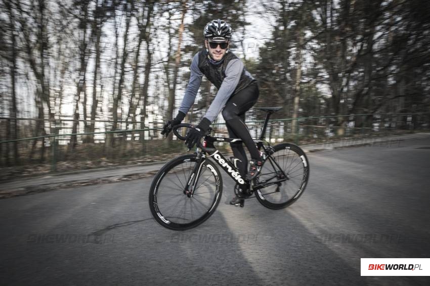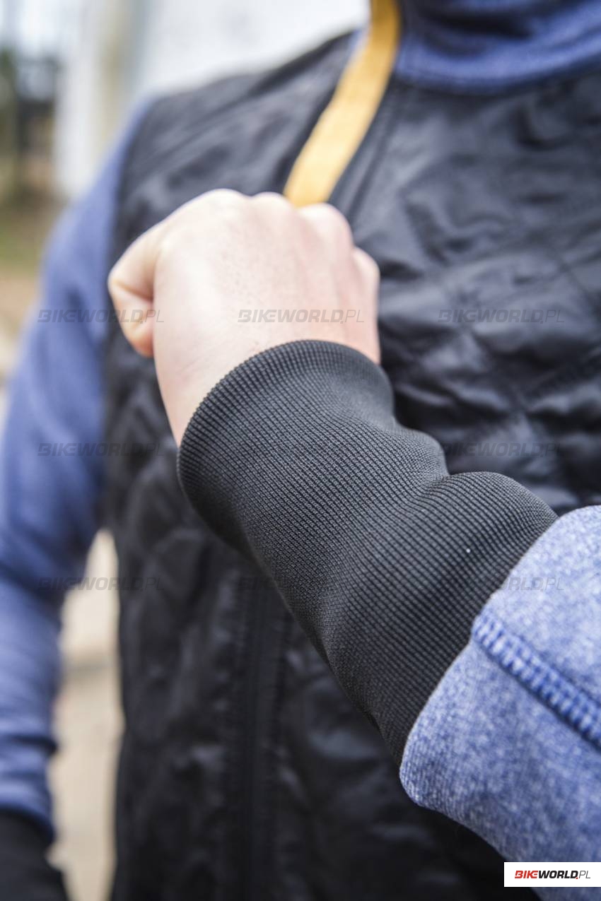 Kurtka Heidi powstaje z mieszaniny dwóch materiałów - poliestru (61%), którego zadaniem jest odprowadzanie nadmiaru wilgoci na zewnątrz oraz polipropylenu (34%), który dba o to by użytkownik pozostał suchy. Po założeniu kurtki zbadaliśmy jej krój. Rozmiar M pasował w gruncie rzeczy dobrze aczkolwiek kurtka w przedniej części mogłaby być delikatnie dłuższa. Krój określić można jako sportowy, ale na pewno nie jako dokładnie dopasowany i obcisły, co jest pozytywną informacją dla większości kolarzy, rzadko wycieniowanych tak mocno jak zawodnicy WorldTour'u. Z tyłu odnajdziemy trzy kieszenie: dwie mniejsze po bokach oraz główną, zamykaną, która jest bardzo dużych rozmiarów i wydaje się być aż za duża, co może powodować poruszanie się przedmiotów w jej wnętrzu. Miłym akcentem był kołnierz, który idealnie oplatał szyję i w istotny sposób przyczynił się do utrzymania ciepłoty tej delikatnej części ciała.