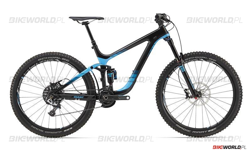 Lista jest bogata, bo sprzęt wyposażono chyba we wszystkie cechy nowoczesnego roweru tego typu. Obok wspomnianych już materiałów ramy do wyboru, mamy i koła 27,5 cala (Giant świadomie lansuje je jako jedyny słuszny rozmiar), skok 160 mm, zawieszenie Maestro i parę innych bardziej standardów niż „ekstrasów” takich jak: wewnętrzne prowadzenie linki do sztycy regulowanej, stożkowa rura sterowa, przerzutka przednia direct mount, hamulce post mount, mocowania ISCG05, konwertowalna oś 135/142 mm z tyłu. Rower ma 4 rozmiary do wyboru, włącznie z bardzo długim S (wybierze go pewnie paru amatorów Mki), jak i porządnym XL (gdyby Gee jeździł na Giancie....). Z cech dających się zmierzyć, na drugi rzut oka warto wymienić niższy środek ciężkości, jak i środek suportu, mniejszy przekrok, ale większy rozstaw kół. Wyjątkowy jest widelec, który ma nietypowy offset, wynoszący 46 mm (standard to 42 mm). Z kolei kąt wyprzedzenia widelca to najmodniejsze dziś 65 stopni.