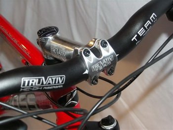 Po kilku dniach od tej rozmowy kurier doręczył mi pudło. Wieeelkie pudło, ponieważ rower był prawie całkowicie złożony i gotowy do jazdy. Nawet przerzutki były wyregulowane. Jedyne, co zrobiłem, to podkręciłem przedni hamulec i obróciłem mostek. Pierwsze, co rzuca się w oczy to intensywny czerwony kolor ramy oraz ogromna, długa na 640 mm, gięta kierownica Truvativ Team Oversized (powinienem bardziej powiedzieć czarna, aluminiowa brecha!!).