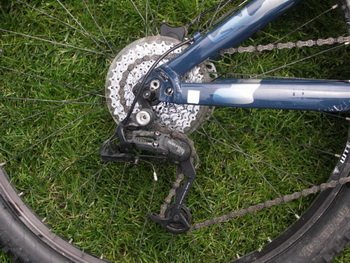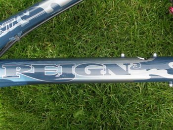 Rama wygląda na solidną i starannie wykonaną. Uwagę zwraca potężne wzmocnienie rury podsiodłowej. Reign nie posiada możliwości zastosowania hamulca szczękowego, choć prawdopodobnie ciężko byłoby znaleźć kogoś, kto chciałby zamontować do takiej ramy coś innego niż tarczówkę. Stonowane, granatowe malowanie z delikatnymi i subtelnymi napisami i wzorkami nie rzuca się zbytnio w oczy, ale za to jest bardzo eleganckie. Komponenty Za 6 tysiaków dostajemy nie tylko fajna ramkę, ale również niezły osprzęt. Zacznijmy od napędu. Zastosowano korbę Ride XC kanadyjskiego Race Face’a, łańcuch Shimano HG 53 oraz dziewięciorzędową kasetę SRAM z największą zębatką 34, która pozwala podjechać nawet na bardzo strome wzniesienia. Przerzutka tylnia i manetki są również SRAMowskie, co wróży długie i poprawne działanie nawet mimo ton błota na tarasie. Poza tym obsługiwane wyłącznie kciukiem Triggery X-7 są bardzo wygodne w użyciu i pozwalają na bezproblemową zmianę biegów również w trakcie hamowania. Przednia przerzutka to japoński LX. Jeżeli warunki nie są całkowicie ekstremalne napęd działa bez żadnych zarzutów. Problemy miałem tylko wtedy, kiedy przedzierałem się przez jakieś totalne bagno i jechałem rowerem do połowy zanurzonym w wodzie. Łańcuch został wtedy kilka razy wciągnięty ze środkowej tarczy korby pod ramę.