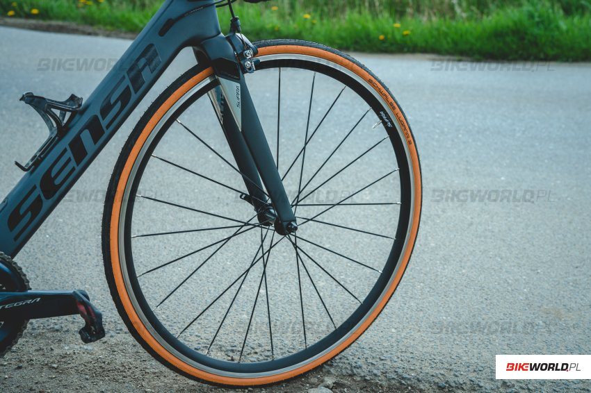Pozostałe komponenty brandowane są logo Supra, czyli marki in-house Sensy. I tak, oprócz wspomnianej już carbonowej, spłaszczonej sztycy mamy aluminiową kierownicę o szerokości 42cm i bardzo przyjemnym gięciu oraz koła RA Elite. Nie należą one do najlżejszych czy najbardziej aerodynamicznych opcji, natomiast nie mamy żadnych uwag do ich sztywności, a w końcu aby móc zaoferować rower w takiej cenie, producent musiał poszukać gdzieś oszczędności. Jednak już na etapie zamawiania roweru, możemy zamienić podstawowe koła na aluminiowo-carbonowe stożki Supra RCA55, które nie tylko dużo lepiej wyglądają, ale też lepiej "niosą" przy wyższych prędkościach. Przyjemność ta będzie nas kosztować dodatkowe 2tys. złotych.
