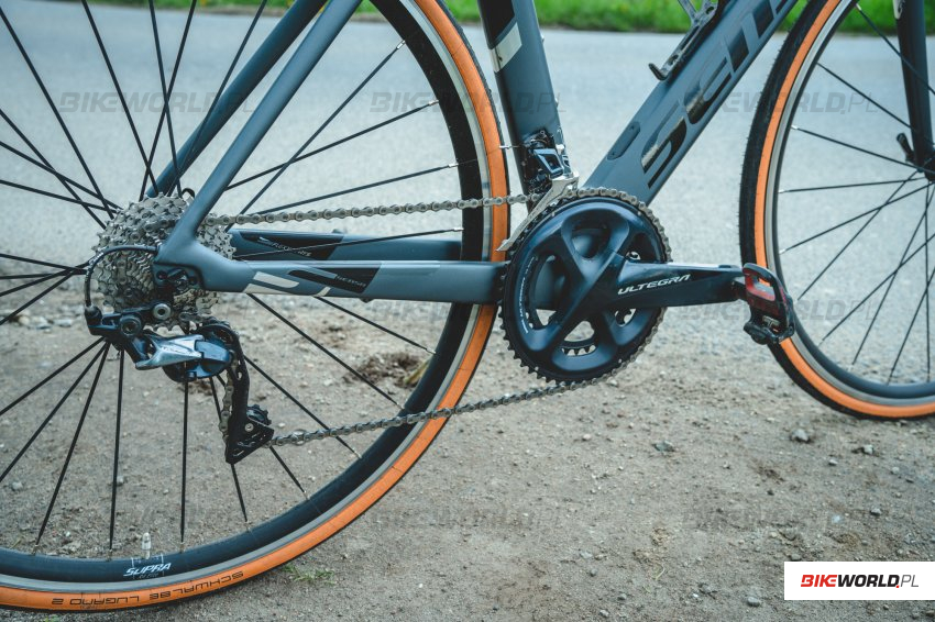 Tak jak pisaliśmy we wstępie, w tych widełkach cenowych próżno szukać roweru na kompletnej mechanicznej Ultegrze z serii 8000, którą to znajdziemy na pokładzie Sensy. Producent zdecydował się na korbę compact, czyli z zębatkami 50/34 oraz kasetę o rozpiętości 11-30. Taki setup daje bardzo szeroki zakres przełożeń, jednakże w naszym odczuciu jest to dosyć zachowawczy wybór i w rowerze tego typu bardziej wydzielibyśmy klasyczne szosowe 53/39 ewentualnie "neo-compact" 52/36, rezerwując compact dla rowerów typu endurance. To jednak kwestia indywidualnych preferencji i watów pod nogą. Niezależnie od nich działanie napędu stoi naprawdę na najwyższym poziomie. W końcu Ultegra zapożycza większość rozwiązań konstrukcyjnych z topowej Dura-Ace, a różni się od niej tylko zastosowanymi materiałami, a co za tym idzie masą i przede wszystkim ceną. Klamkomanetki pracują bardzo lekko (so świadczy również o dobrym poprowadzaniu pancerzy), a biegi wchodzą szybko, gładko i precyzyjnie.