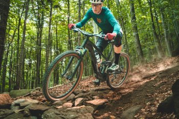 Nasz EX 8 to drugi model od dołu, oparty o aluminiową ramę i dobre, choć nadal dość podstawowe komponenty. Realna masa testowanego egzemplarza w opcji ,,gotowy do jazdy”, czyli z pedałami, po 150 ml mleka (na jedno koło) w oponach i koszykiem na bidon to równe 22,6 kg. To nadal lekko, bo jednak zachowanie roweru 22,5 kg, a 25 kg w ciasnych sekcjach pokonywanych na małych prędkościach jest odczuwalnie lżejsze i bardziej poręczne. Prowadzenie roweru to oczywiście wynik nie tylko wagi, ale też geometrii, czy kinematyki zawieszenia, natomiast czuć, że masa EX 8 nie przytłacza. Rower da się sprawnie przenieść przez powalone drzewo, włożyć na bagażnik samochodowy, czy złamać w ciasnym nawrocie, bez poczucia, że operujemy przegubowym ikarusem. O jeździe jednak za moment.