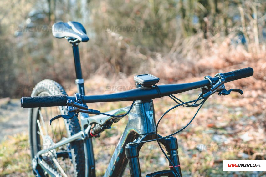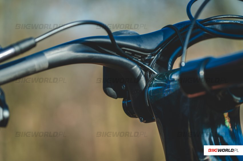 Równie ciekawy jest jednoczęściowy kokpit. Kierownica ma aż 780mm szerokości, a "wirtualna" długość mostka wynosi od 50 do 90mm w zależności od rozmiaru (70mm w testowanym przez nas rozmiarze M). Kąt mostka wynosi stosunkowo "łagodne" -8 stopni. Ciekawie rozwiązano prowadzenie kabli. Na całe szczęście nie są one prowadzone wewnętrz kierownicy, tylko od spodu kierownica posiada kanały na przewody, które są następnie zakrywane dopasowaną gumową osłoną. Wygląda to świetnie i nie nastręcza przy tym dodatkowych problemów serwisowych. Zresztą zobaczcie sami - specjalnie ją zdjęliśmy do zdjęć. W zestawie dostajemy też elegancki topcap ze zintegrowanym mocowaniem licznika - na zdjęciach rower z armią podkładek - taki "urok" rowerów testowych - nie każdy może chcieć ustawiać kokpit tak nisko jak my.