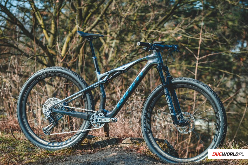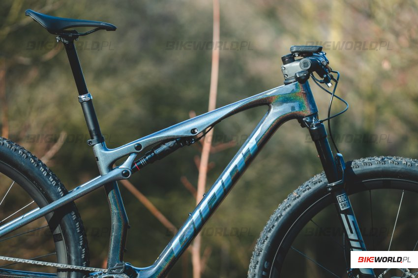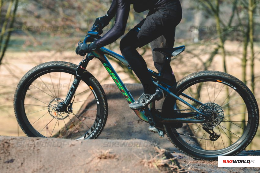 Do redakcji trafił model oznaczony numerem 1, czyli najtańszy wyposażony w carbonowy kokpit i koła. Zawieszenie, podobnie jak w innych modelach dostarcza RockShox - w tym modelu są to odpowiednio SID z przodu oraz SIDLuxe z tyłu, obydwa w wariancie Select+, sterowane zdalną, trzystopniową manetką TwistLoc Ultimate. Wyposażanie uzupełnia niezawodna bezprzewodowa grupa napędowa SRAM GX Transmission, bardzo mocne hamulce Shimano XT oraz szerokie (2.4") i szybkie opony Maxxis Aspen EXO MaxSpeed. Do tego mamy komponenty in-house tajwańskiego producenta - bardzo lekki dropper o pokaźnym skoku 140mm (110mm w rozmiarze S) i konstrukcji analogicznej jak choćby w FOXie Transfer SL.