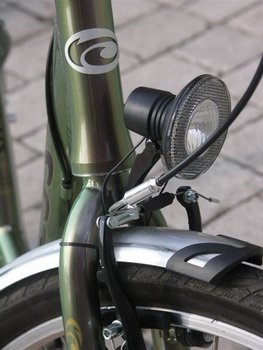 Downtown ma chyba wszystko to, co powinien posiadać dobry rower miejski. Zacznijmy od oświetlenia zasilanego prądnicą umieszczoną w przedniej piaście Shimano Dynamo hub 3N20. Z przodu mamy klasyczny reflektor halogenowy, na którym umieszczono przełącznik, a z tyłu lampkę diodową i odblaski. Co ciekawe, układ zasilania posiada mały kondensator, dzięki któremu tylna lampka nie gaśnie w czasie postoju. Jest to proste, ale znakomite rozwiązanie poprawiające znacznie bezpieczeństwo rowerzysty w nocy. Dodatkowo mamy oczywiście komplet pomarańczowych odblasków na kołach.