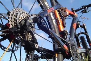 Jak nietrudno się domyślić Prestige - duma stajni KTM - ubrany został w kompletną grupę XTR. O ile hamulce i korba nie robią większego wrażenia, warto na dłużej zatrzymać się przy nowej przerzutce tylnej typu Shadow. Założeniem japońskich inżynierów było zmniejszenie podatności na uszkodzenia podczas jazdy w terenie, co faktyczne udało się uzyskać. Przerzutka mieści się w obrysie ramy, co zdecydowanie zmniejsza ryzyko jej urwania. Co więcej, zmieniono element mocowania do haka poprzez wyeliminowanie sprężyny przy śrubie mocującej, upodabniając tym samym przerzutkę do amerykańskiego SRAMa. Dzięki temu konstrukcja zdecydowanie zyskuje na sztywności. Dodatkowo całość jest lżejsza od wersji klasycznej! Połączenie sprawdzonych przez konkurencję rozwiązań wraz z kilkoma innowacjami sprawiło, że przerzutka nie obija się o ramę, a wraz z manetkami typu Rapidfire zapewnia bardzo dokładna pracę.