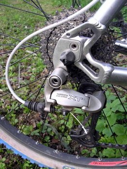 Special Edition został wyposażony w napęd z grupy Shimano XT (nie XT 04). Z grupy XT jest wszystko, nawet środek suportu! XT'ek jak wszyscy wiedzą odznacza się wysoką precyzją działania, niezawodnością, i obojętnością na warunki atmosferyczne. Jedyne, co go różni od High-endowego XTR to waga i cena. Manetki to znane i lubiane RapidFire'y, które w wersji XT działają niesamowicie precyzyjnie. Płynnej i dokładnej zmianie biegów nie przeszkadza nawet bardzo duże błoto. Korby wykonane w technologii Holowtech (są puste w środku), odznaczają się niską wagą i tym że przekazują każdy Wat energii w napęd. Oczywiście montuje się je na wielowpust Octalink, a do ich odmontowania nie jest potrzebny specjalny ściągacz, wszytko za pomocą jednego imbusa 8mm. Pedały to zwykłe metalowe platformy od VP, wiec od razu po kupnie Meridy wymieniłem pedały na moje stare Shimano PD-M525.