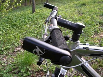 Po prawej stronie została umieszczona dźwignia płynnej blokady skoku (czyli inaczej płynna regulacja tłumienia, od szybkiego po całkowitą blokadę). Jeśli komuś nie chce się schylać do blokady, może dokupić specjalną manetkę na kierownicę, bardzo szkoda ze seryjnie nie jest montowana.Niestety parę dni po zakupie roweru okazało się dostał prawa głosu i zaczął wydawać z siebie tykanie, więc prędko udałem się do sklepu z zamiarem jego wymiany. Wymiana amortyzatora trwała dość długo dlatego dostałem od sklepu amortyzator ?zastępczy?. Niestety na zdjęciach jest właśnie ten ?zastępczy?, zresztą też Suntour. Widelec został bez większych komplikacji wymieniony i w drugim egzemplarzu już wszystko było OK. Sr Suntour nie jest podobny do Maracochów tylko z wyglądu, ale również kulturą działania. Po odpowiednim dobraniu ciśnienia (na mój gust te z instrukcji są troszeczkę za wysokie) działa niesamowicie. Amortyzator wybiera równie dobrze małe nierówności jak i te znacznie większe. Po zblokowaniu jest sztywny jak zwykłe widełki, co jest bardzo przydatne przy podjazdach i sprintach po asfalcie, jeździ się wtedy prawie jak na szosówce. Sr Suntour jak na swoją klasę (XC, Maratony) wykazuje się wystarczającą sztywnością boczą. Oczywiście jest przystosowany do montażu hamulca tarczowego w standardzie międzynarodowym. Niestety zgodnie z modą ?sztuciec? nie został wyposażony w gumowe harmonijki chroniące golenie górne przed zarysowaniem, dlatego musiałem dokupić ochraniacze neoprenowe. Jedyne czego mi w Suntourze brakuje to systemu skracania skoku, a przy tym skoku na pewno by się taka możliwość przydała.
