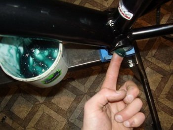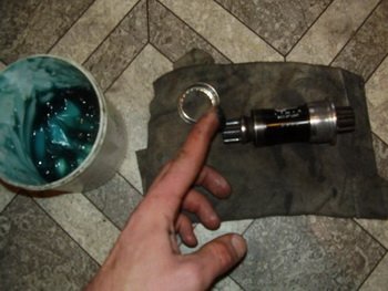 Usuwamy szmatką nadmiar smaru. Po przejechaniu około 100km dociągamy śrubami korbę. Jeżeli dźwięki nie ustąpiły, trzeba będzie wymienić suport lub same łożyska.