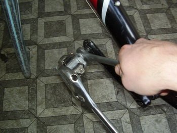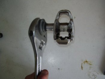 Wykręcamy pedał a następnie ośkę. W starszych modelach odkręcamy pedał imbusem 6mm, klucz TL-PD40 osadzamy na wielowypuście, przytrzymujemy francuzem i kręcąc pedałem wykręcamy ośkę.