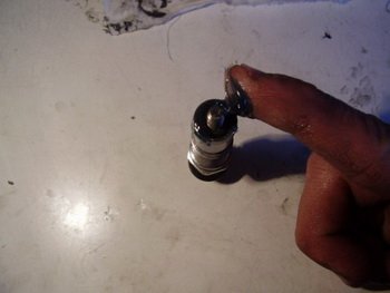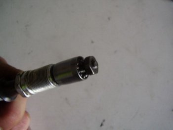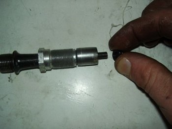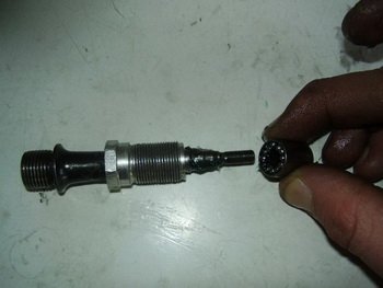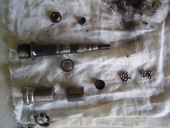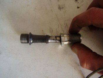 Środek jak i korpus pedału dokładnie czyścimy. Teraz całość trzeba złożyć. Na nasmarowaną ośkę zakładamy gumową uszczelkę i tuleje(aluminiowa) z gwintem.