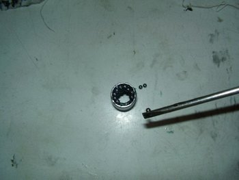 Przechodzimy do najtrudniejszej czynności. Trzeba ułożyć na końcach metalowej tulei po 12 kuleczek. Najpierw jeden koniec delikatnie smarujemy, przy pomocy małego śrubokręta układamy kuleczki