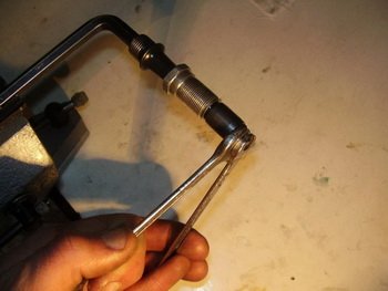 Nakręcamy stożek kluczem płaskim 10mm. Ośkę pedału można zablokować w imadle, ułatwi to nam regulację