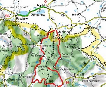 Do Głuchołaz najlepiej dojechać pociągiem z pobliskiej Nysy. Popołudnie warto przeznaczyć na zwiedzanie Głuchołaz. Głuchołazy zostały założone już na początku XIII wieku. Wydobywane w okolicy złoto przyczyniło się do szybkiego rozwoju miasta, które stało się stolicą okręgu. Do dziś z dawnych „złotych czasów” miasta zachowało się wiele zabytków. Najstarszym zabytkiem miasta jest szachownicowy układ urbanistyczny. Tworzy go prostokątny rynek i dziesięć wybiegających z niego ulic oraz łukowe ulice, prowadzące dawniej wzdłuż murów miejskich, zbiegające się przy dawnych bramach - Górnej i Dolnej. Wieża bramy górnej wzmiankowana była już w 1418 - obecną, 25-metrową, postawił ok. 1600 wójt głuchołaski. Ulice, łączące obie bramy i biegnące wzdłuż rynku, wyznaczały przebieg starego traktu Wrocław – Morawy. Ponoć taki układ miast byt wzorowany na rzymskich obozach wojskowych. Na środku rynku znajdował się ratusz, który niestety nie dotrwał do naszych czasów. Wokół rynku znajdują się zabytkowe kamieniczki zgrupowane w 4 „kwartałach" ,pochodzą w większości z okresu po pożarach w 1834. Do ciekawszych obiektów Głuchołaz zaliczyć można także Kościół młodzieżowy św. Franciszka, Kościółek św. Rocha i Kościół parafialny św. Wawrzyńca, który Jest najstarszym zabytkiem miasta. Pierwsze wzmianki o tym obiekcie pochodzą bowiem z 1285 roku. Po popołudniowym spacerze czas znaleźć nocleg. Nie powinno być z tym żadnych problemów, gdyż baza noclegowa w Głuchołazach i okolicach jest bardzo dobrze rozwinięta. Ja jednak szczególnie polecam Młodzieżowe Schronisko Turystyczne. Koszt noclegu wynosi tylko 13 zł (uczniowie i studenci), mamy do dyspozycji łazienkę z prysznicami, kuchnię. Czas ruszać na trasę. Z centrum Głuchołaz kierujemy się na Jesenik i Sumperk w stronę przejścia granicznego (UWAGA! W pobliżu Głuchołaz znajdują się dwa przejścia graniczne. My kierujemy się na przejście Głuchołazy – Mikulovice). Pożegnanie z Polską nie jest jednak takie łatwe. Musimy najpierw pokonać podjazd o nachyleniu 6 %. Po około 500 metrach podjazdu osiągamy szczyt wzniesienia i czeka nas dosyć szybki i kręty zjazd, na którym trzeba szczególnie uważać, aby... nie ominąć przejścia granicznego, które znajduje się na zjedzie. Lepiej więc trzymajmy ręce na naszych hamulcach, żeby nie mieć problemów z celnikami. Odprawa na granicy trwa dosłownie chwilkę i można ruszać na podbój Republiki Czeskiej. Już na pierwszych kilometrach widać znaczną różnicę w stanie nawierzchni, która w Czechach jest lepsza. Po lewej stronie widzimy najwyższy szczyt Gór Opawskich – Biskupią Kopę (889 m.n.p.m). Pomimo, iż trasa prowadzi drogą krajową, ruch pojazdów jest niewielki. Również jest dosyć płasko, dlatego jazda jest samą przyjemnością. Wzdłuż drogi to raz po prawej, to po lewej płynie rzeka „Bela”, która jest wspaniałym panaceum na letnie upały. Kąpiel wskazana! Na naszej trasie znajdzie się również coś dla miłośników speleologii. Wystarczy skręcić w prawo w miejscowości Pisecna i po kilometrze drogi dotrzemy do rezerwatu „Jaskinie na Spicaku”. Po 17 kilometrach od Głuchołaz dojeżdżamy do Jesenika. Tutaj warto zrobić przynajmniej godzinną przerwę. W mieście znajdują się dwa muzea - Powiatowe Muzeum regionalne (Twierdza na Wodzie) i Muzeum Vincenze Priessnitze Lázn. Najciekawszą dzielnicą Jesenika jest część uzdrowiskowa, do której aby dotrzeć należy pokonać kilometrowy podjazd o nachyleniu 10%. Należy zachować szczególną uwagę przy zjedzie, gdyż drogę przecinają tory kolejowe. Z Jesenika ciągle kierujemy się drogą nr. 44. Droga nadal bardzo łatwa, wciąż wzdłuż rzeki. Po kilku kilometrach w miejscowości Adolfovice po lewej i prawej stronie drogie, na zboczach wzgórz, znajdują się betonowe bunkry, pozostałości z lat drugiej wojny światowej. Jeżleli chcemy im się przyjrzeć z bliska, musimy zabrać ze sobą latarkę i wysokie buty, najlepiej kalosze. Po 7 kilometrach od Jesenika docieramy do rozwidlenia dróg. Należy kierować się dalej na Sumperk.