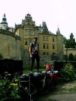 Teraz czekał nas szaleńczy zjazd do Świeradowa Zdroju. Chwilami prędkość zbliżała się do 70 km/h, z ciężkimi sakwami umieszczonymi jedynie z tyłu pojazdu nie jest łatwo go prowadzić, szczególnie w zakrętach lub gdy trzeba się gwałtownie zatrzymać. Zaczęło mżyć. Przykro mi to pisać, ale w Świeradowie potraktowano nas jak obdartusów, nikt z zapytanych nie chciał nam wynająć pokoju na noc, albo cena była astronomiczna, sięgająca 40 zł od osoby za nocleg. Właściciele kwater i pensjonatów nastawieni są na bogatych, starszych Niemców, których bardzo wielu przyjeżdża do Świeradowa Zdroju. Straciliśmy dużo czasu, zmokliśmy, byliśmy już bardzo zmęczeni tym szukaniem. W Kamieniu, kilka kilometrów od Świeradowa Zdroju jest schronisko PTSM, zdecydowaliśmy więc, że podejmiemy jeszcze ten wysiłek i pojedziemy tam. Ja prowadziłem, ponieważ przejeżdżałem obok tego schroniska, gdy wracałem z Bike Challenge’u, jadąc na stację kolejową w Rębiszowie. W schronisku zostaliśmy bardzo miło przyjęci. Nie było co prawda wolnych miejsc, ponieważ pokoje były zarezerwowane przez młodzież udająca się na Światowe Dni Młodzieży do Kolonii, ale mieliśmy ze sobą namioty. Po prysznicu i kolacji poszliśmy spać. Na licznikach 53 km. Dzień 3 Znowu deszcz, tym razem intensywne opady. Poniedziałek rozpoczął się nieciekawie, padało, było zimno i wcale nie wyglądało na to, żeby miało zamiar szybko przestać. W taką pogodę nie ma większego sensu wyruszać w drogę, szczególnie w góry. Mimo to pojechałem do Świeradowa Zdroju. Oczywiście porządnie zmokłem. Przejaśniać zaczęło się dopiero około południa. Zjedliśmy „obiad”, a żeby nie zmarnować całego dnia zaplanowaliśmy wycieczkę do zamku Czocha. Zamek jest wart zobaczenia, pięknie położony nad jeziorem. Wycieczka liczyła około 35 km po dolnośląskich pagórkach. Na moim liczniku było w sumie 46 km. Z nadzieją na „lepsze jutro” poszliśmy spać. Dzień 4