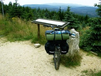 Startując w maratonach MTB w Janowicach Wielkich i w Polanicy Zdrój w 2003 roku, oraz w Złotym Stoku i w Bike Challenge w tym roku, miałem okazję przekonać się na własne oczy, że Sudety są wymarzonymi górami do jazdy na rowerze. Maratony mają to do siebie, że można się ścigać, nie mając pojęcia, gdzie się jest i którędy się jedzie. Podczas wyścigu nie ma też zbyt wiele czasu na podziwianie widoków, to, co się głównie ogląda to las i kawałek drogi przed sobą. Na wyjazd zebrał się skład identyczny jak w zeszłym roku. Ja, Magda i Jacek, oraz nasze rowery, te same, które toczyły się po nadmorskich piaskach. Do wyprawy trzeba się było starannie przygotować. Oto lista „rowerowych” przedmiotów, które zabrałem: rower, bagażnik rowerowy, sakwy boczne i górna, bidon, pompka, dętka, zestaw naprawczy do dętek, narzędzie wielofunkcyjne, taśma izolacyjna, scyzoryk, olej do łańcucha (wziął Jacek), szmata do czyszczenia łańcucha, plecak rowerowy, strój rowerowy (kask, buty LOOK, krótkie i długie spodenki rowerowe, koszulka termoaktywna, dwie koszulki kolarskie, kurtka z membraną Windstoper, skarpety rowerowe), przednia i tylna lampka rowerowa, czołówka Petzl z trzema białymi diodami do zamocowania na kasku, zapięcie rowerowe. Tutaj jest lista wyposażenia pozostałego (aczkolwiek niezbędnego): namiot Bergson (około 3 kg), śpiwór, karimata, apteczka pierwszej pomocy, ubrania „cywilne” (bielizna, spodnie, skarpety, podkoszulki), klapki pod prysznic, ręcznik, mydło, kosmetyki (koniecznie krem z dobrym, wysokim filtrem), szczotka i pasta do zębów, papier toaletowy, chusteczki higieniczne, pieniądze i dokumenty (koniecznie dowód osobisty lub paszport, jeżeli przebywa się w strefie nadgranicznej, niekoniecznie mając zamiar przekraczać granicę), telefon i ładowarka, zapasowy zestaw akumulatorków i ładowarka, mapy turystyczne, aparat cyfrowy i zapasowa karta pamięci, drugi scyzoryk, zapalniczka, zeszyt, długopis, worki foliowe, jedzenie (również batony, najlepiej bez czekolady), woda. Tego nie wziąłem (a żałowałem): Peleryna przeciwdeszczowa (padało), miniradio, albo lepiej odtwarzacz MP3 (miło posłuchać wieczorem muzyczki), więcej gotówki (dwudniowa awaria systemu bankowego), „cywilne” buty (najlepiej turystyczne), najnowsze mapy (z zaznaczonymi szlakami rowerowymi), szczoteczka do czyszczenia łańcucha, worek na wodę (zamiast bidonu), kubek, sztućce, miska. Ku mojej wielkiej radości udało się nam zsynchronizować urlopy i w piątek, 12 sierpnia wyruszyliśmy w podróż pociągiem ze stacji Kraków Główny do Zgorzelca. Pociąg, którym pojechaliśmy do Wrocławia odjeżdżał o 23:01. Za bilet normalny zapłaciliśmy po 49,54 zł od osoby z rowerem. Planowany przyjazd do Zgorzelca o 8:21. Dzień 1